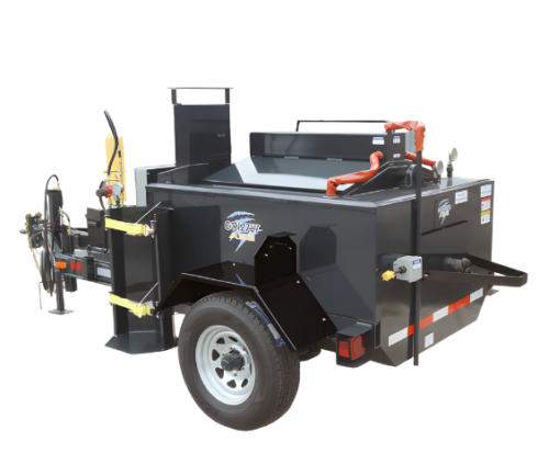| 130 gal | 10-ga steel, fully welded | 6 hp Kubota diesel | Hydraulic | Gravity pour | Diesel (single source) | 5,200 lbs | (2) 225/75/R15 | Roofing, waterproofing, crack sealing |